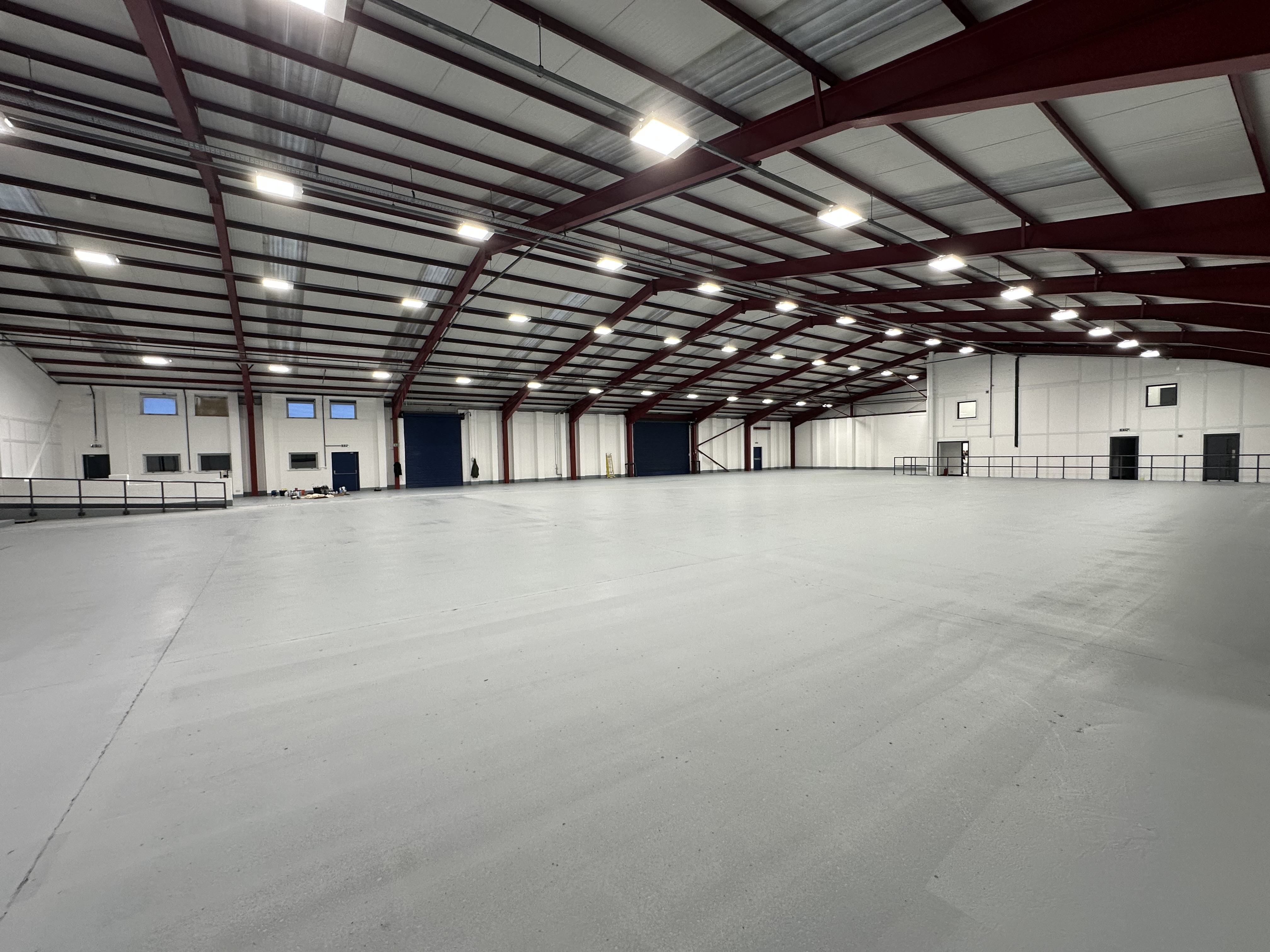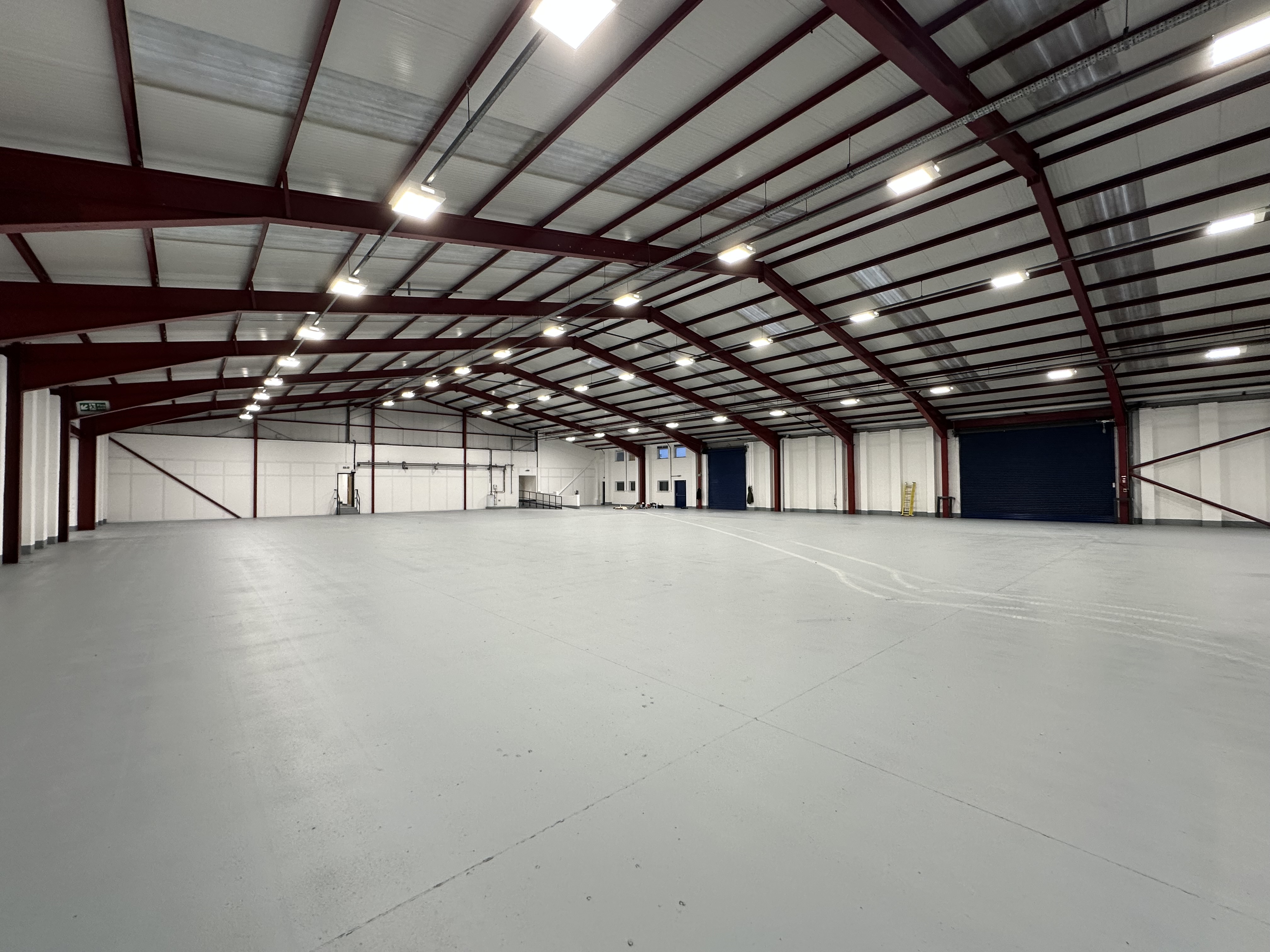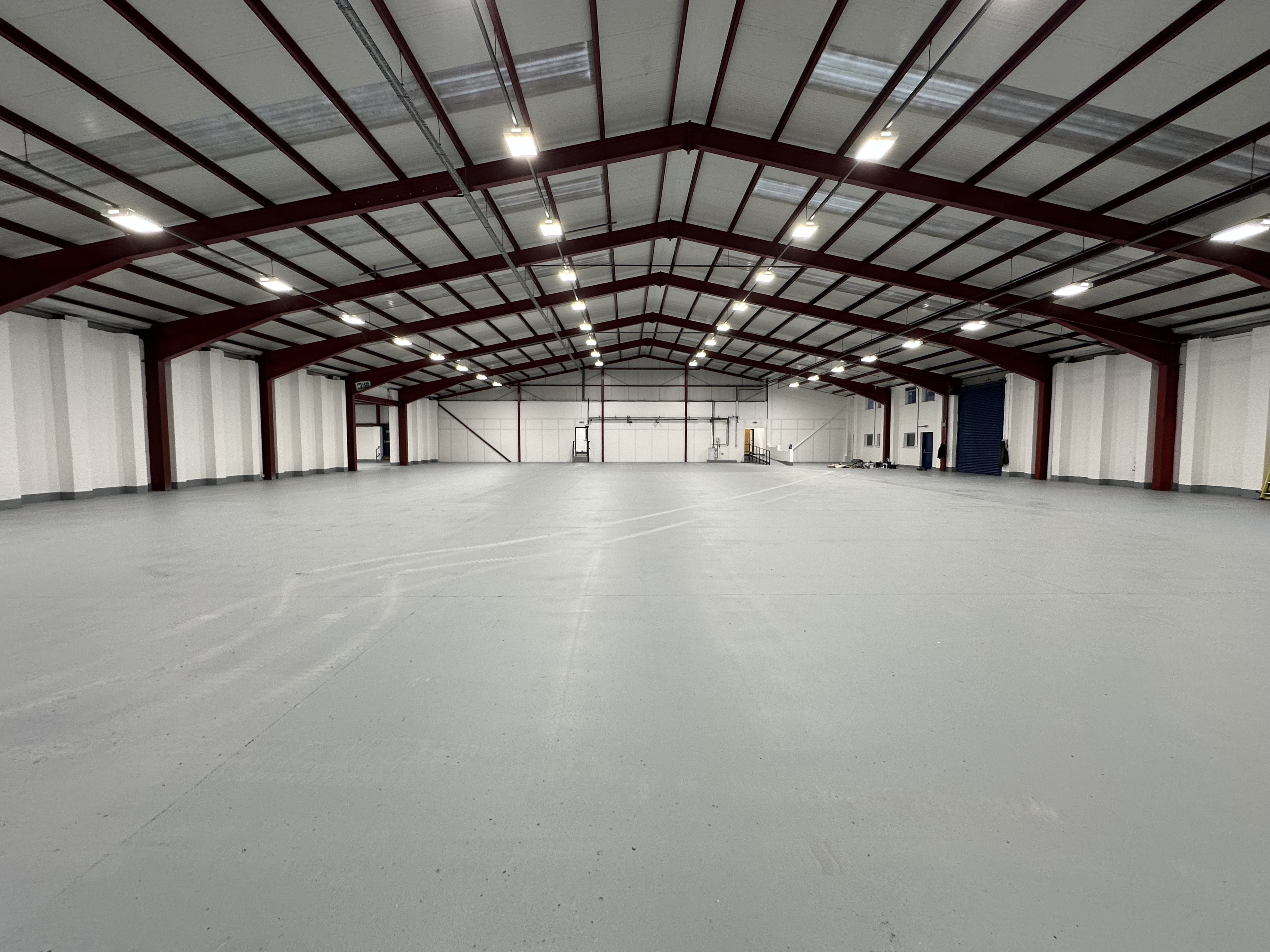 The premises comprise a steel portal framed industrial/warehouse unit benefiting from lined insulated profile metal sheet roof incorporating translucent roof lights, profile metal sheet cladding to the elevations, minimum eaves height of 5.2m, high bay LED lighting, 3x electric roller shutter loading doors, and concrete reinforced floor.