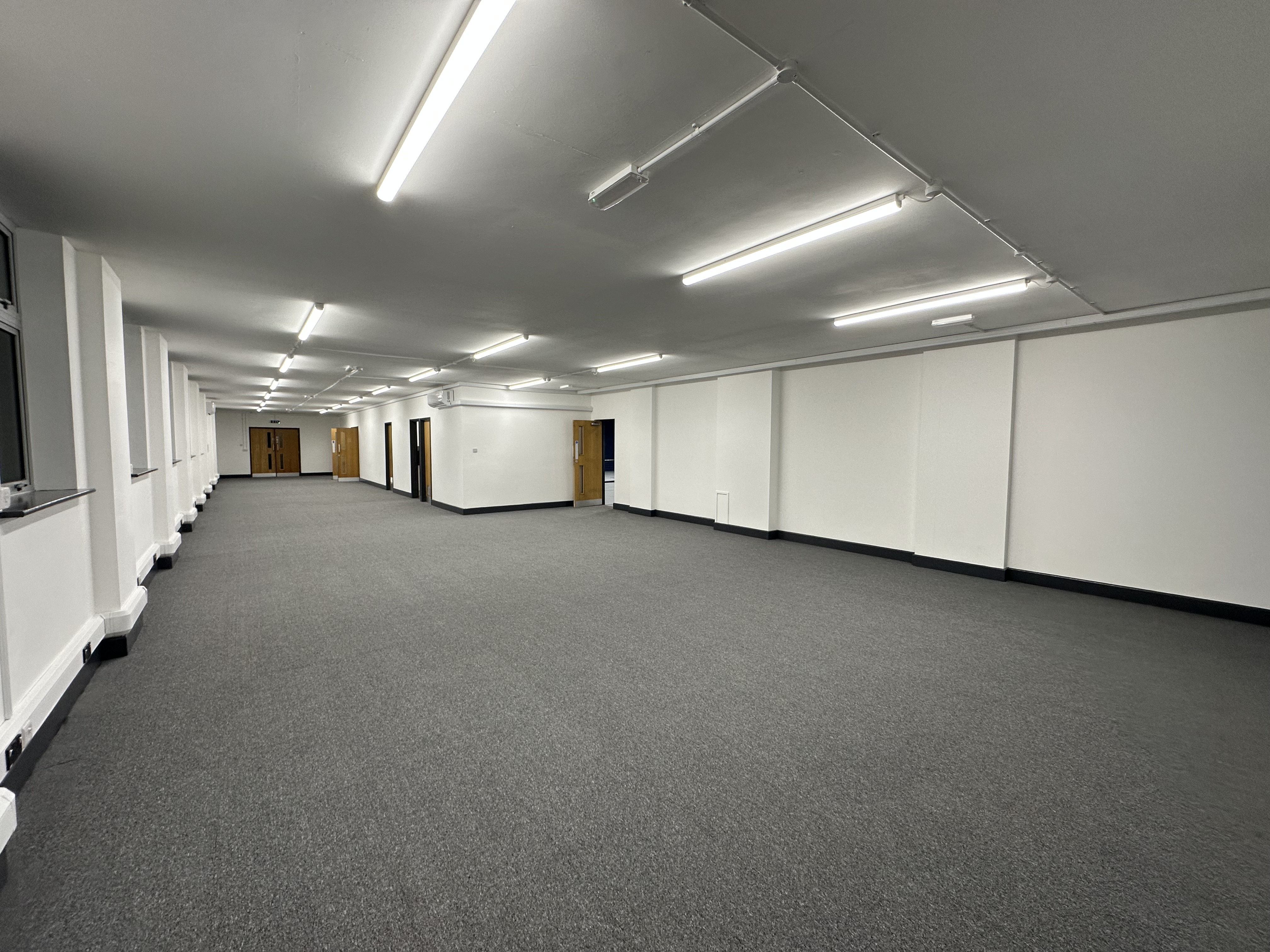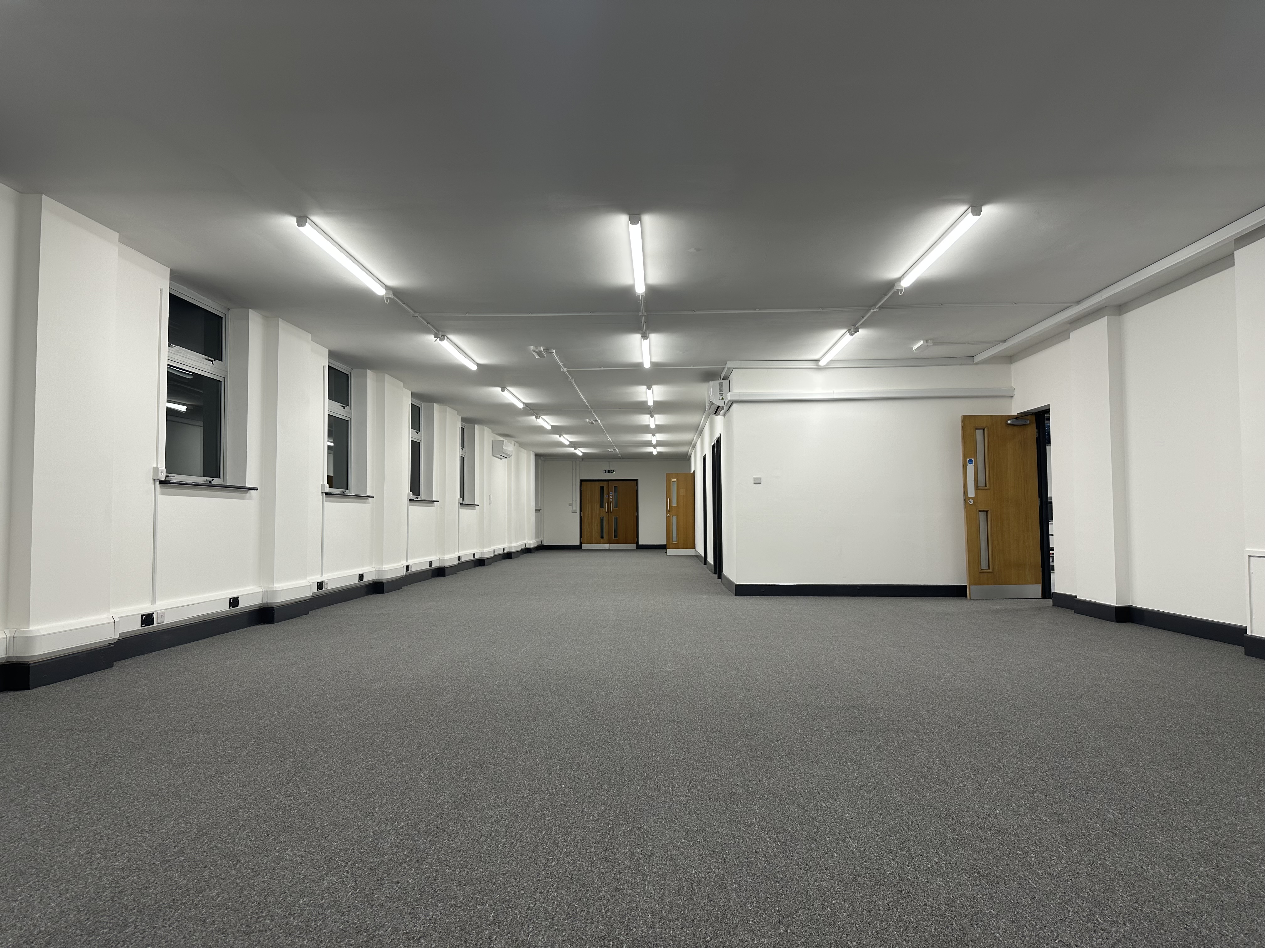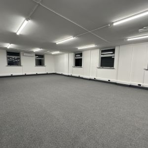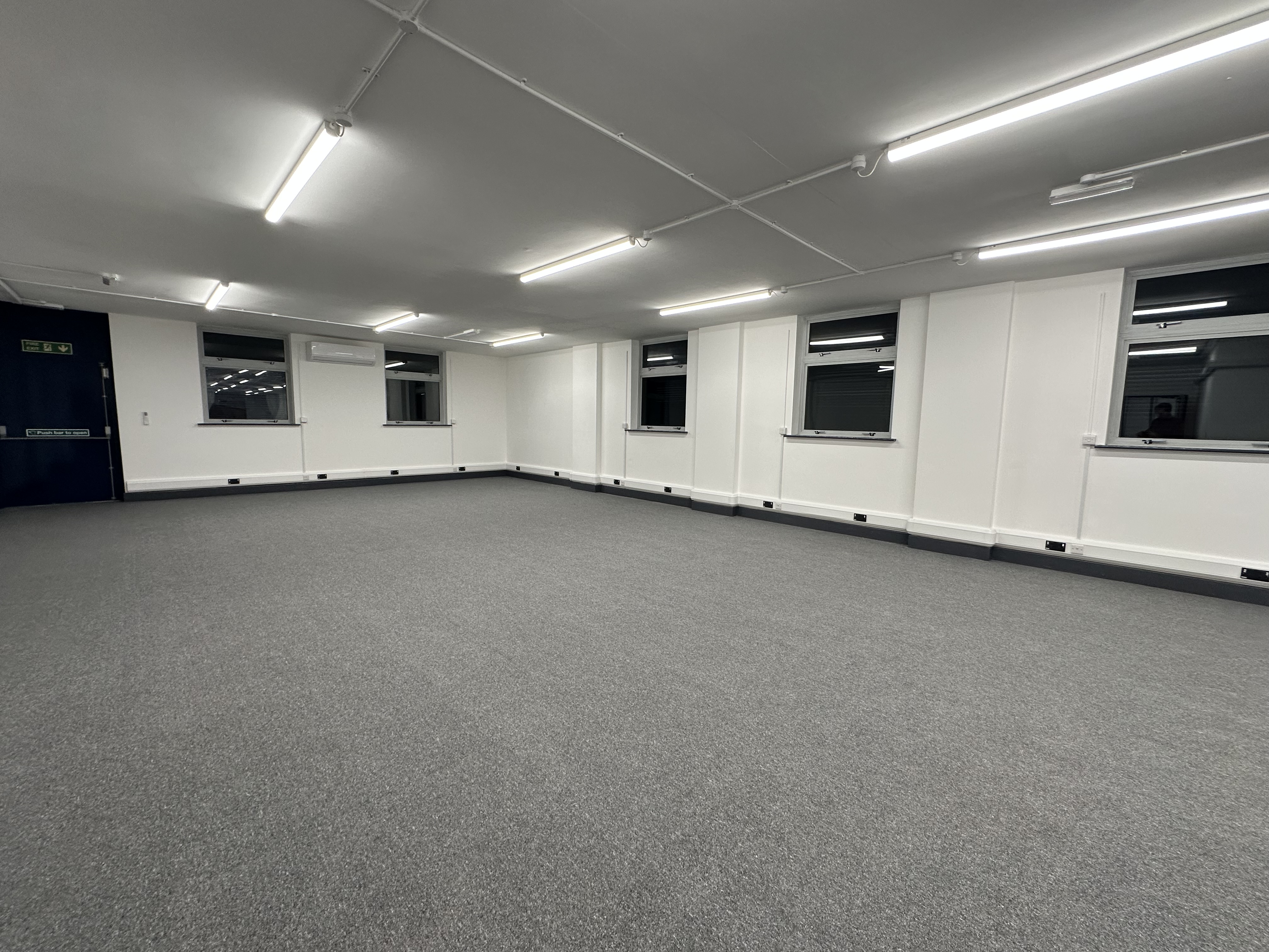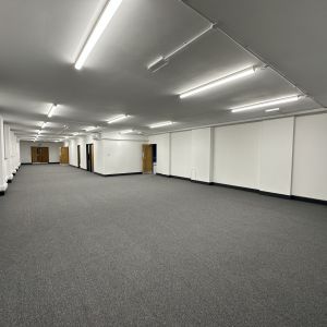 Single storey mainly open plan offices to the front elevation with painted plastered walls, carpet tiled floors, and dado level perimeter trunking and electric security shutters to the windows.