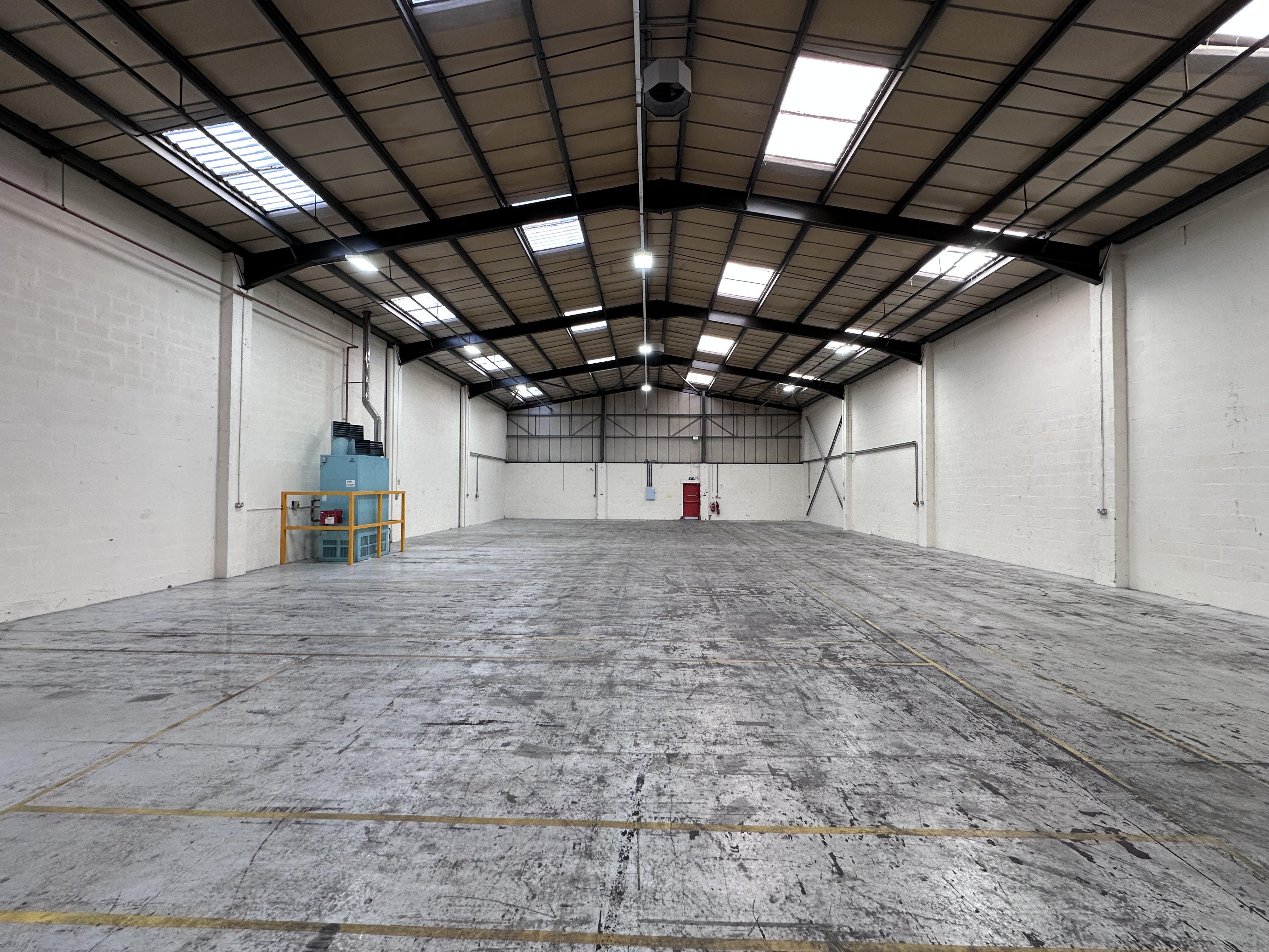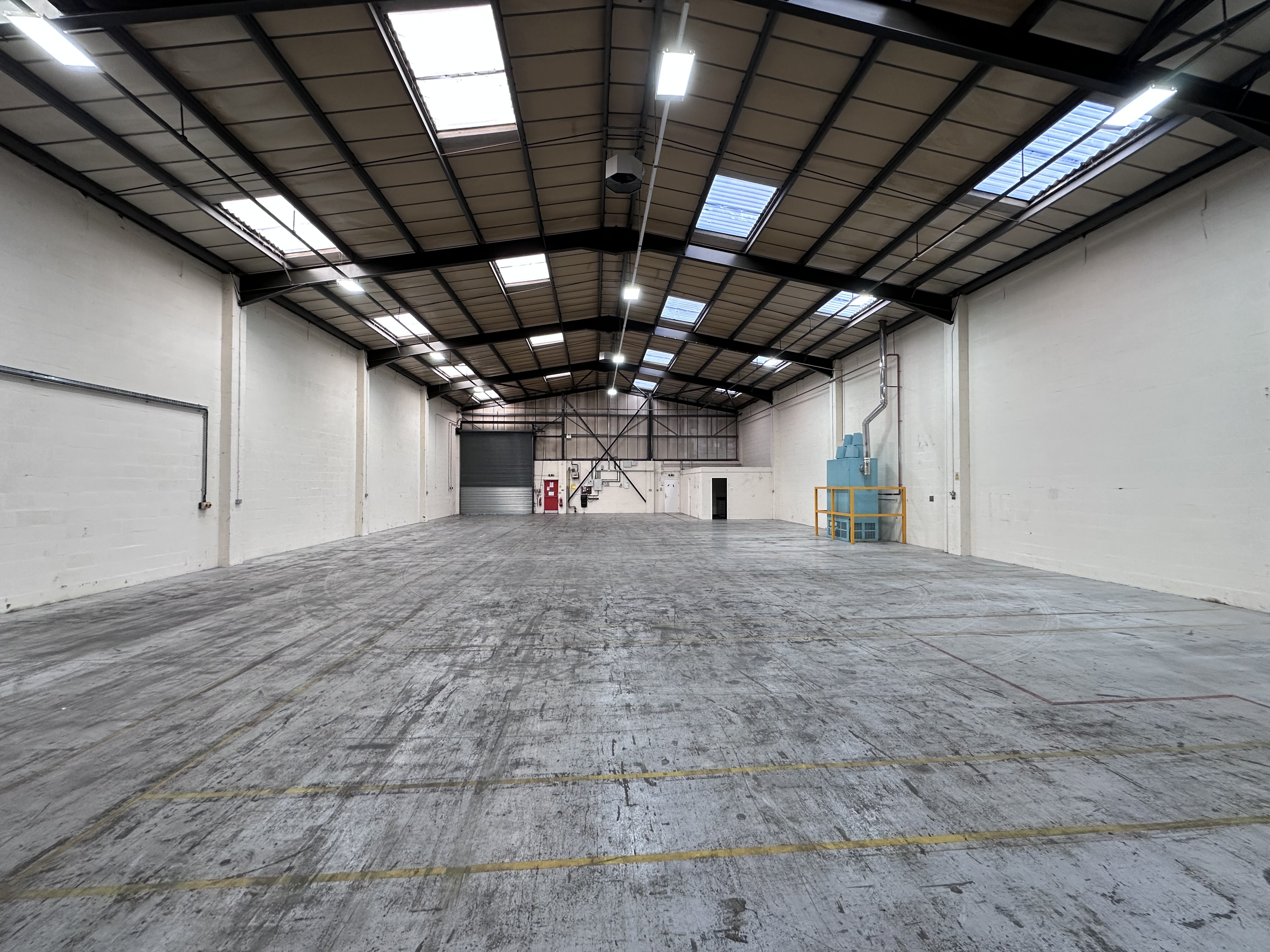 Comprising of a mid-terraced steel portal framed building with brick and block work lower elevations and insulated profile steel clad panels above. The roof is covered with corrugated sheet cladding incorporating translucent light panels. The warehouse is accessed via an electrically operated roller shutter door (4m wide x 4.6m high), and will benefit from LED lighting to be fitted throughout the property. Eaves height of the warehouse is 6.3m.